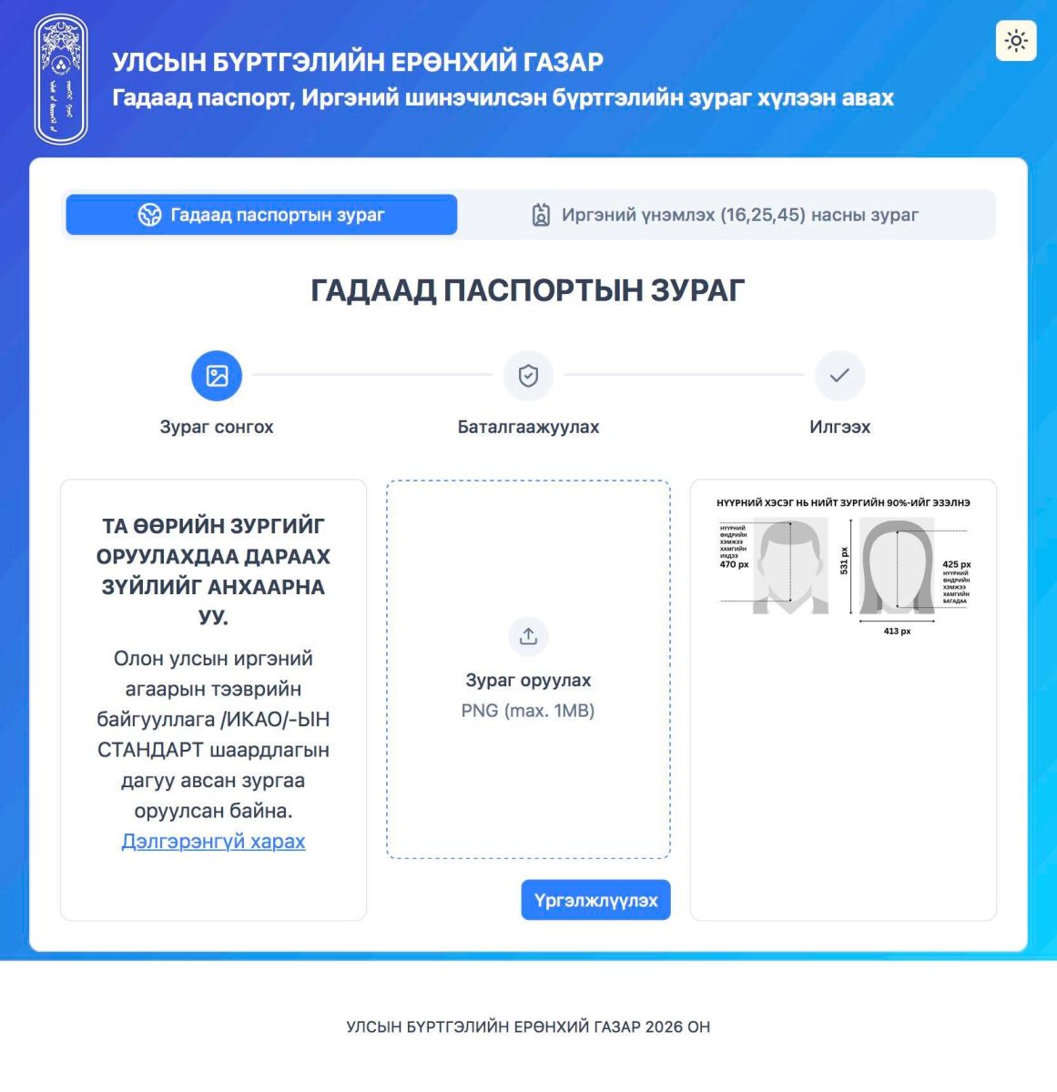 Иргэд та бүхэн гадаад паспортын зураг болон 16, 25, 45 насанд солих иргэний үнэмлэхийн зургийг зааврын дагуу цахимаар илгээх боломж бүрдлээ.